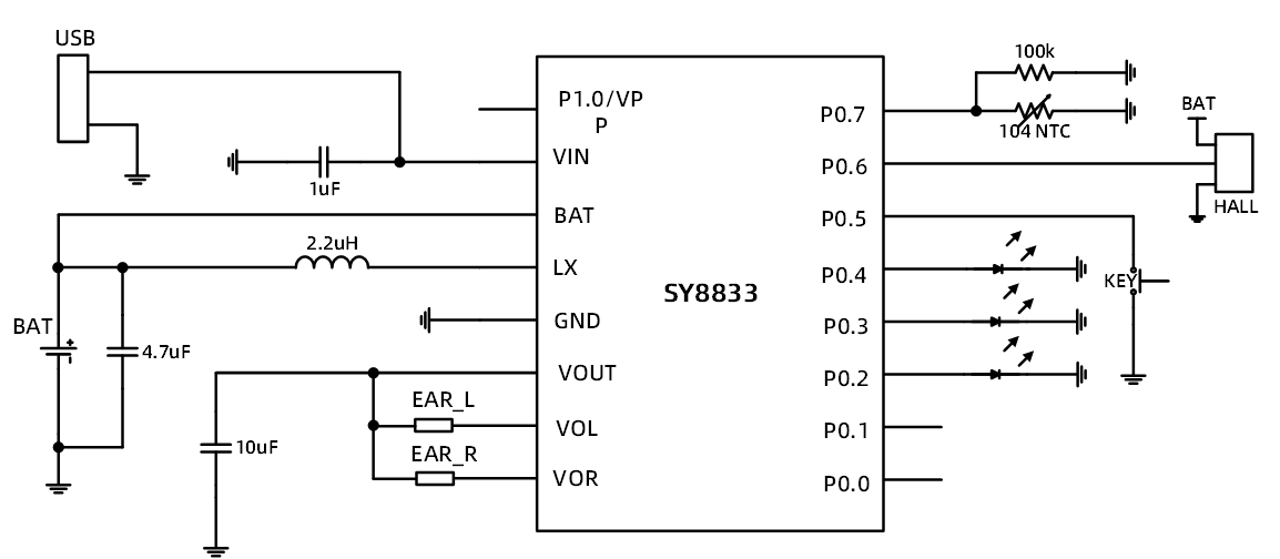 SY8833是專門為TWS耳機充電倉設(shè)計的全集成SoC芯片。SY8833內(nèi)部集成了兼容8051指令集的CPU,256字節(jié)RAM, 4k字節(jié)OTP程序存儲區(qū),多通道10位ADC,9個GPIO,一個線性充電模塊,一個Boost升壓模塊和兩個獨立放電控制MOS管。SY8833為SOP16封裝。